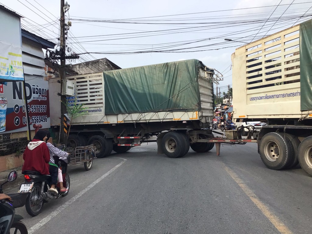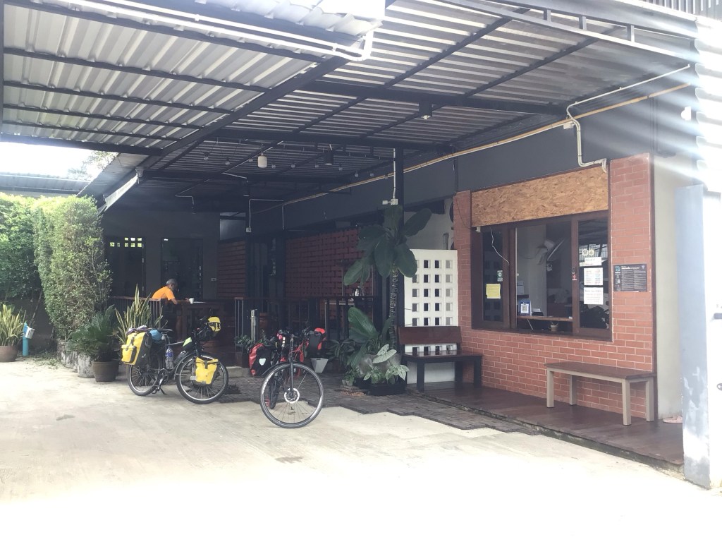 Nous finissons par rejoindre la route principale bien vallonnée qui nous mène à notre destination finale de Rueso. Finalement, sur les 92kms de cette étape, nous n’aurons emprunté qu’une vingtaine de kms sur de grands axes. Et encore sans trop de circulation automobile mais plutôt de scooters. La règle des 80/20 s’est inversée depuis le changement de pays. Vers 16h30, nous arrivons en ville où nous repérons rapidement un endroit où dormir. Sur nos sites Agoda et Booking et sur nos applis GPS, aucun hôtel n’est proposé. Mais la gérante nous propose une chambre à 800THB ce qui nous semble très onéreux ici. Nous partons donc faire un repérage en ville qui se trouve embouteillée par un camion avec remorque dont le chauffeur a bien du mal à se sortir du pétrin.