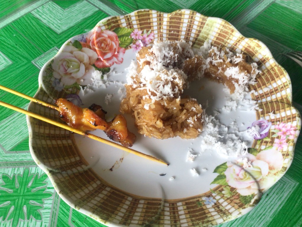 Ce matin, nous testons un p’tit déj’ à base riz et de noix de coco accompagné de brochettes de poulet caramélisé. Perso, j’adore.