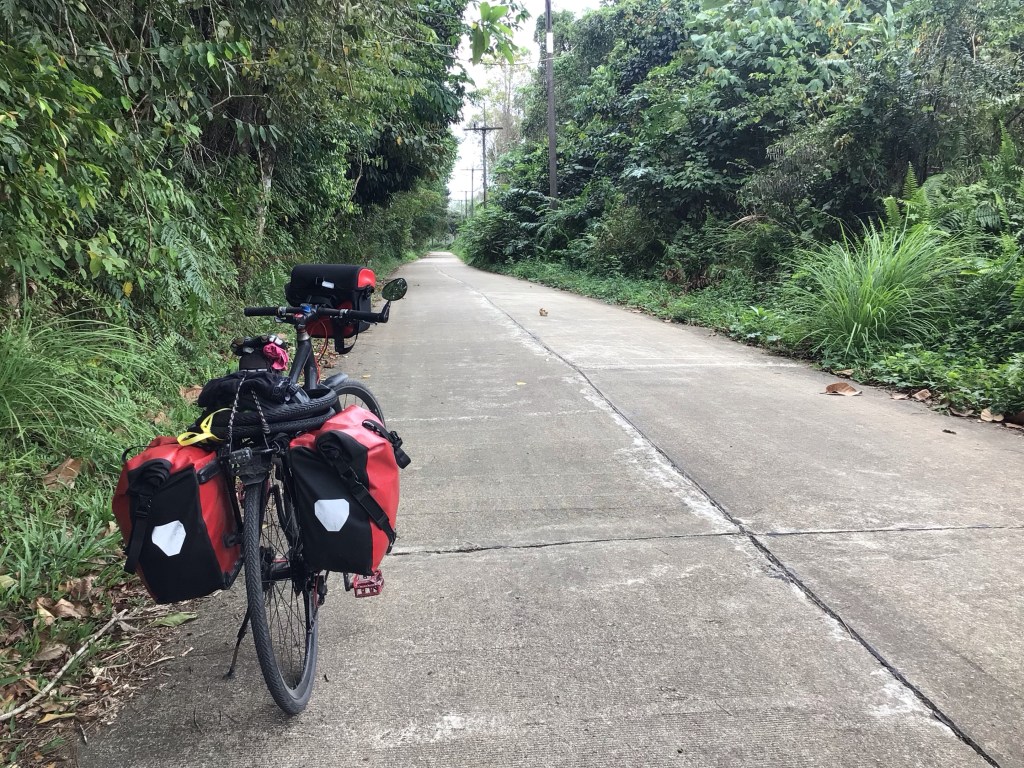 J’achète, dans un des nombreux stands, une barquette contenant du riz curry et un morceau de poulet pané avec un sachet de sauce. Nico m’indique un endroit où nous asseoir à l’abri. Je dévore mon plat en le mangeant avec ma main droite. Contrairement à mon acolyte, j’ai trop la flegme de retourner au vélo chercher mes couverts. En dessert, je me prends 3 crêpes fourrées (une offerte pour mes beaux yeux) à la noix de coco. Un délice. Nous repartons. En sortant du village, je m’arrête à nouveau boire mon café alors que Nico repart à un rythme tranquillou.