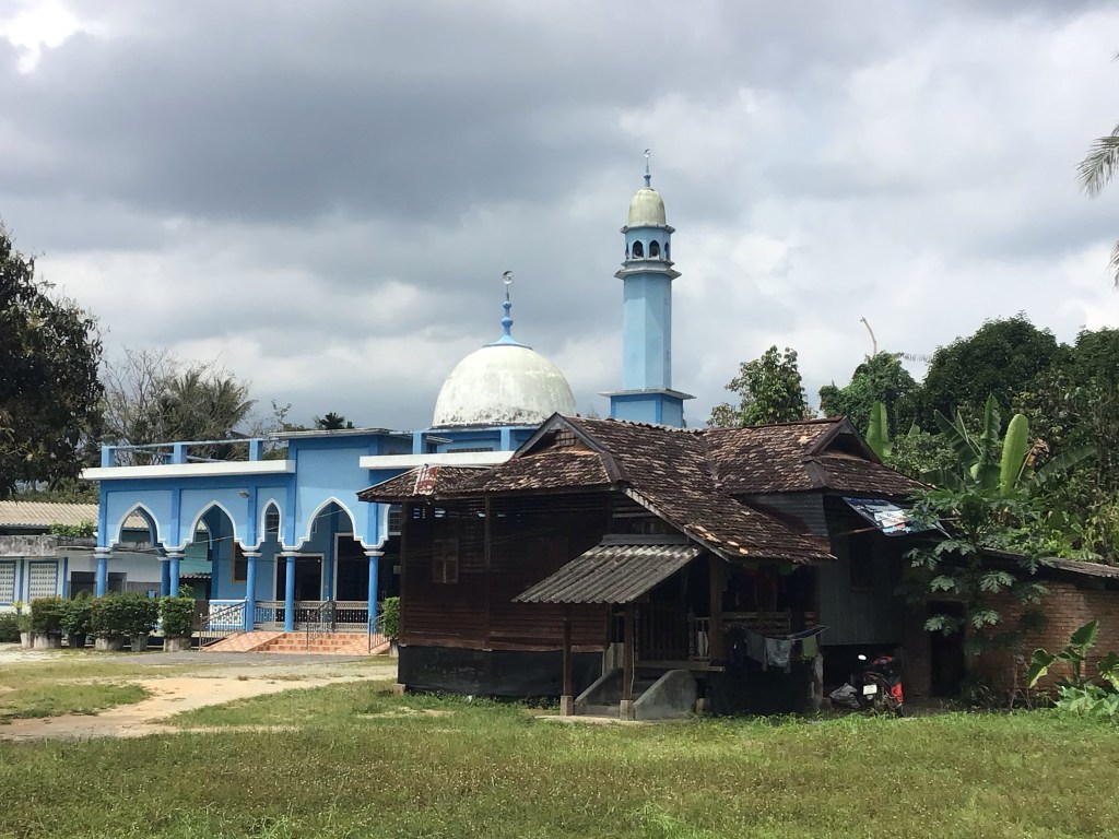 Bien que nous ayons quitté la Malaisie et sa forte communauté musulmane du nord-est, nous retrouvons ici aussi la même présence. Cependant, les haut-parleurs des minarets ne diffusent que les appels à la prière. Malgré les recommandations de Nico, je prends ce plan en photo avec cette vielle bicoque au premier plan et la mosquée bleue en arrière-plan. Le ciel est à nouveau menaçant. Les nuages s’accrochent sur les sommets à plus de 1.000 mètres du parc national de Bang Lang que nous allons contourner par l’est.