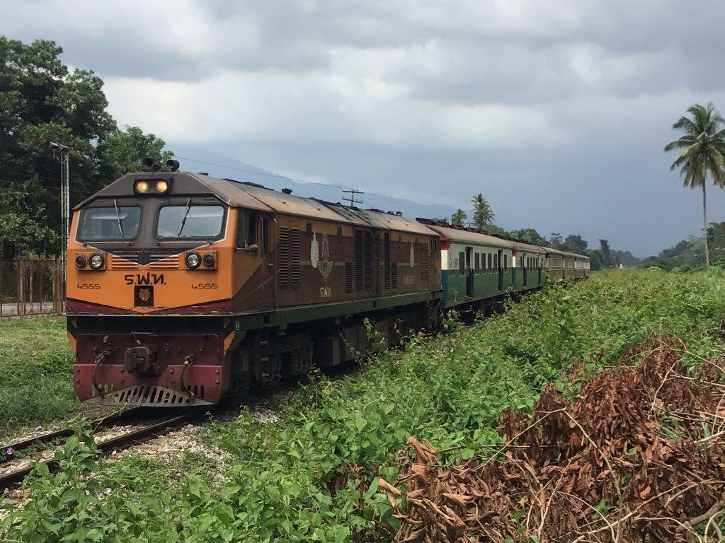 Notre parcours va suivre la voie ferrée qui traverse toute la pointe sud thaïlandaise pour remonter jusqu’à la capitale. C’est une voie ferrée à un seul sens de circulation comme celle que j’avais prise pour redescendre de Chang Mai à Bangkok. D’ailleurs, alors que nous longeons la voie, nous entendons la sirène du train qui rentre en gare.