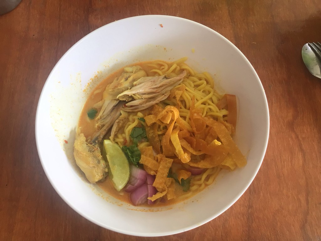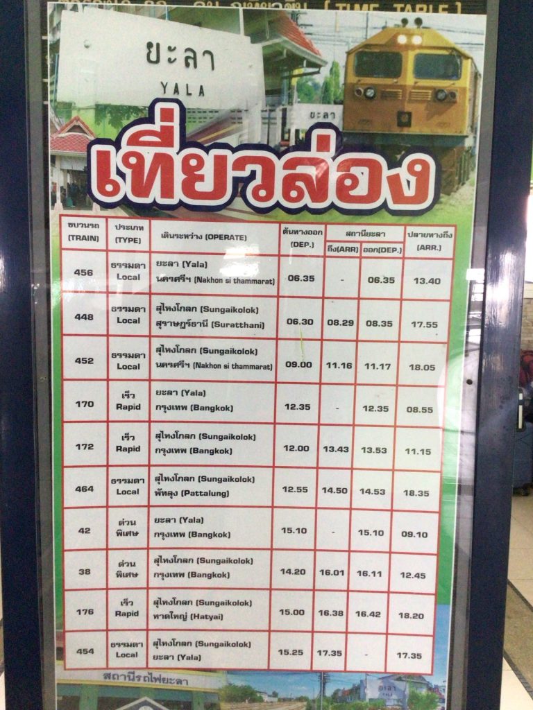 Nous partons à la recherche d’un roti canai. Mais sans succès. Nous trouvons un restau propret tenu par deux jeunes femmes. Ce matin, ce sera nouilles, ships et poulet au p’tit’ déj’. Nous rebroussons chemin pour nous diriger vers la gare et trouver les horaires des trains qui remontent vers le nord. Il y en a un qui part à 13h53 de Yala, à une quarantaine de kms d’ici, vers Thung Song. Cette ville se trouve à 250 kms plus au nord. Elle se situe à l’intérieur des terres à hauteur de Koh Lanta.