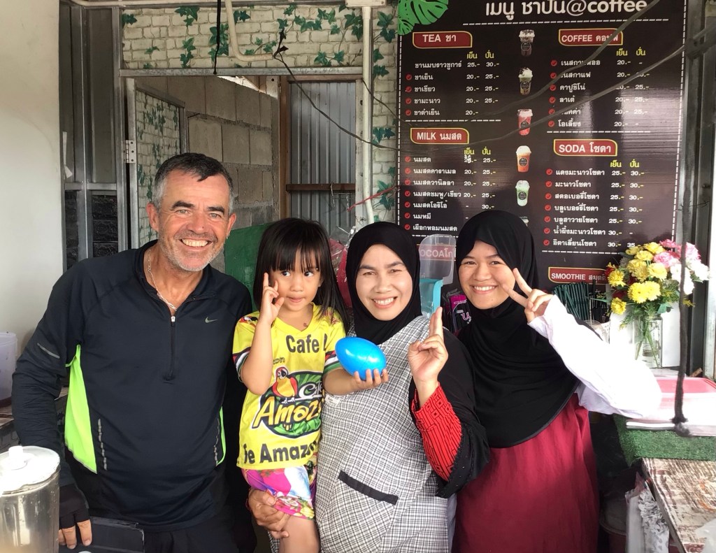 Nous achetons nos billets dont le prix est de 103THB auquel il faut ajouter 90THB pour le transport des vélos soit un peu plus de 5€ pour faire 250kms. Puis nous partons à la recherche d’un endroit où déjeuner. Ce midi, ce sera riz et abats pour moi. A la fin du repas, un jeune garçon, accompagné de sa maman qui parle anglais, arrive à notre table. Elle nous demande si on peut converser en anglais avec son fils. With pleasure ! Il nous demande nos prénoms, notre pays, d’où l’on vient, où l’on va. On discute aussi foot et, bien évidemment, de Mbappé son joueur préféré avec Ronaldo le portugais et Mo Salah l’égyptien. Sa maman nous demande également de nous prendre en photo. Décidément, c’est la journée des stars. Nous acceptons une fois de plus avec grand plaisir.