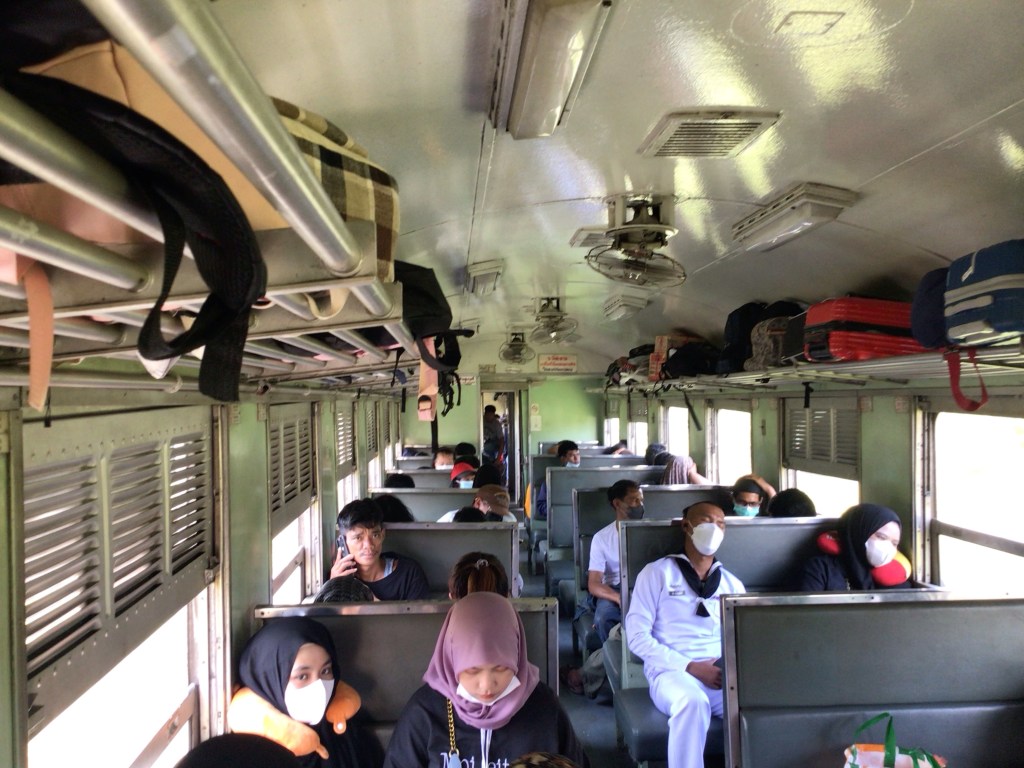 La mienne de place est occupée par une jeune femme qui est avec deux autres femmes plus âgées. Elle ne veut pas libérer sa place. Je laisse Nico en cette charmante compagnie et pars m’installer ailleurs. Le wagon est bondé, le train aussi je pense. La climatisation est assurée par les fenêtres ouvertes. Les sièges sont durs et pas très confortables. Mais ce n’est pas pire que la selle de vélo.