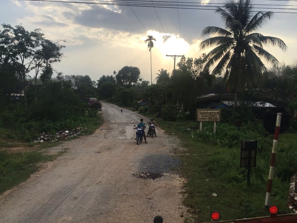 Je profite de ce temps mort pour rédiger ces lignes. Comme cela, ce soir, je pourrais bouquiner pas trop tard et, éventuellement, regarder France-Ecosse en rugby à 22h heure locale. J’essaie aussi de dormir un peu. Mais ce n’est pas facile avec une gamine qui fait sa gym entre 2 sièges juste derrière moi. Arrivé dans la grande ville de Hat Yai, juste au-dessous des grands lacs de Songhkla où nous étions passés à l’aller, le train fait une halte assez longue. De nombreux marchands ambulants en profitent pour monter à bord et vendre leur produit. J’achète un thé glacé. A 16h30, le train repart. Le wagon s’est vidé de moitié. Le train chemine à travers la plaine dans des endroits où nous sommes déjà passés à vélo. Le soleil décline alors que des jeunes à scooter patientent au passage à niveau.
