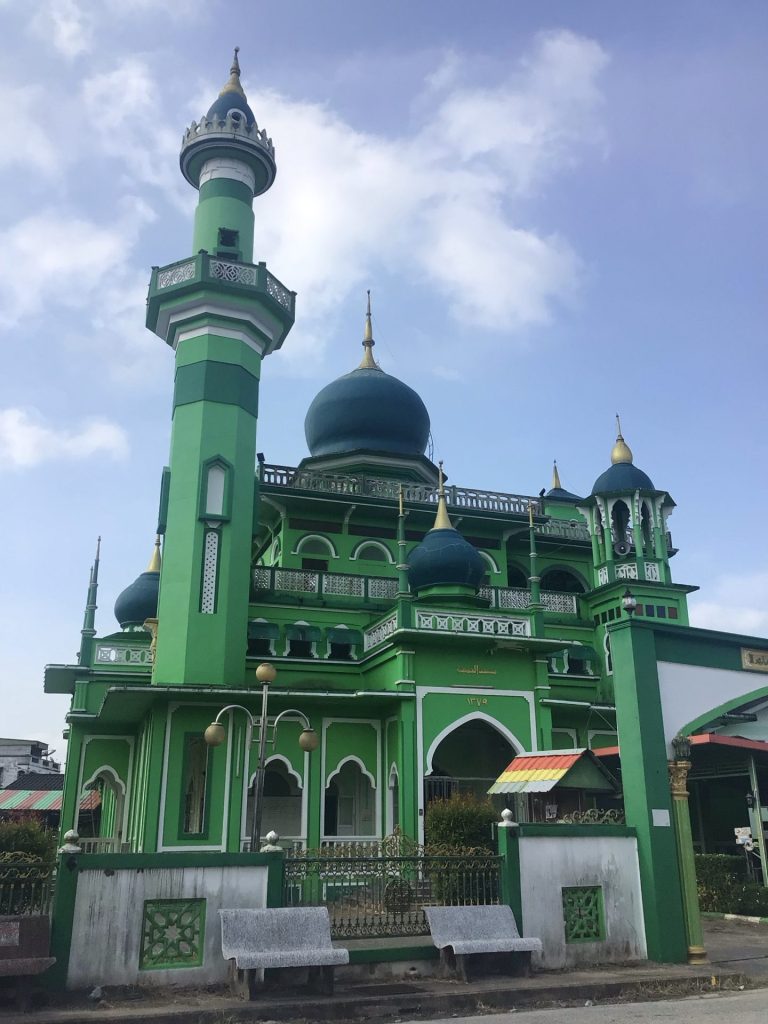 Une fois les horaires récupérés, nous sortons de cette grande ville à majorité musulmane. D’ailleurs, nous passons devant la grande mosquée verte de la ville. Une photo s’impose.