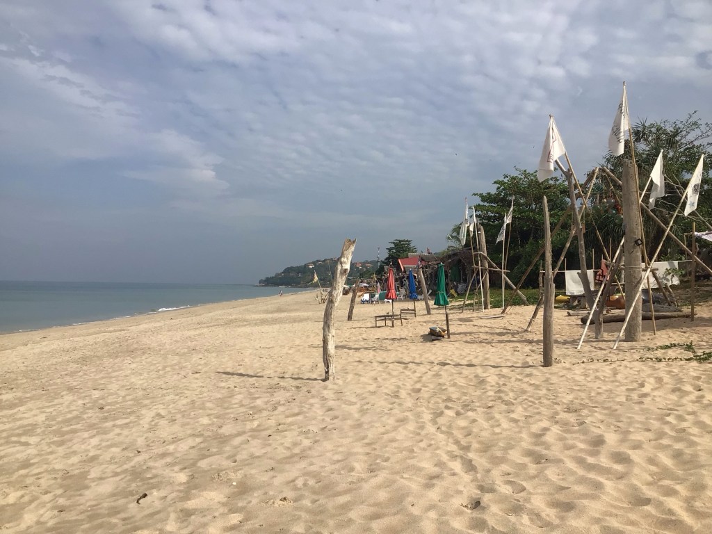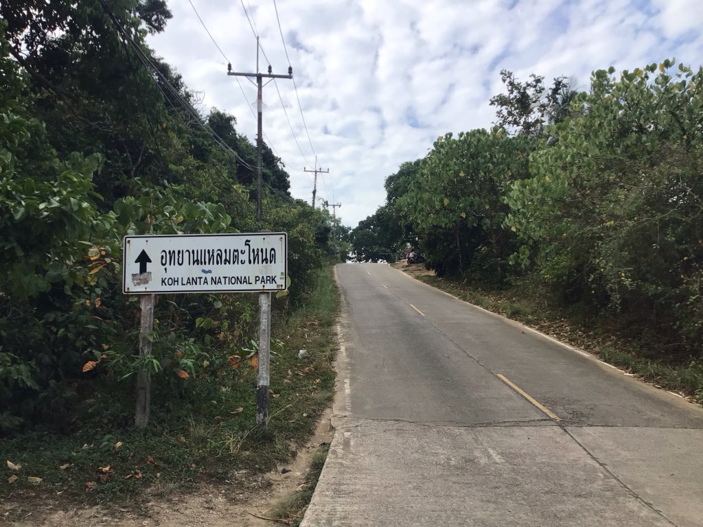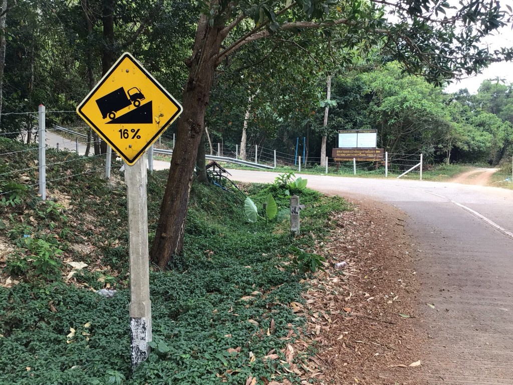 Ensuite, nous roulons quelques kilomètres sur une portion de route plate avant d’attaquer notre première grimpette de la journée pour basculer de l’autre côté de l’île. Je suis obligé de passer la petite plaque pour franchir ces 2 kms à 10%. Puis nous plongeons vers la côte ouest pour arriver sur notre 1ère plage de Klong Toab beach. C’est une grande plage de sable fin avec de nombreux complexes hôteliers et restaurants qui la bordent.