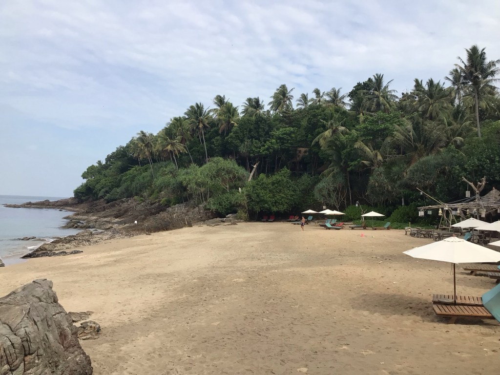 Puis nous attaquons notre descente vers le sud en longeant la mer d’Andaman. C’est vraiment un monde parallèle entre ces deux côtes. D’un côté, la mangrove, des maisons en bois, des musulmanes voilées, des musulmans secs comme des triques; de l’autre, la plage, de beaux complexes hôteliers, des occidentales en maillot de bain, des occidentaux rougeoyants et bedonnants. J’exagère quelque peu le portrait mais à peine … Les longues plages se transforment en crique. Voici celle de Coral Beach.