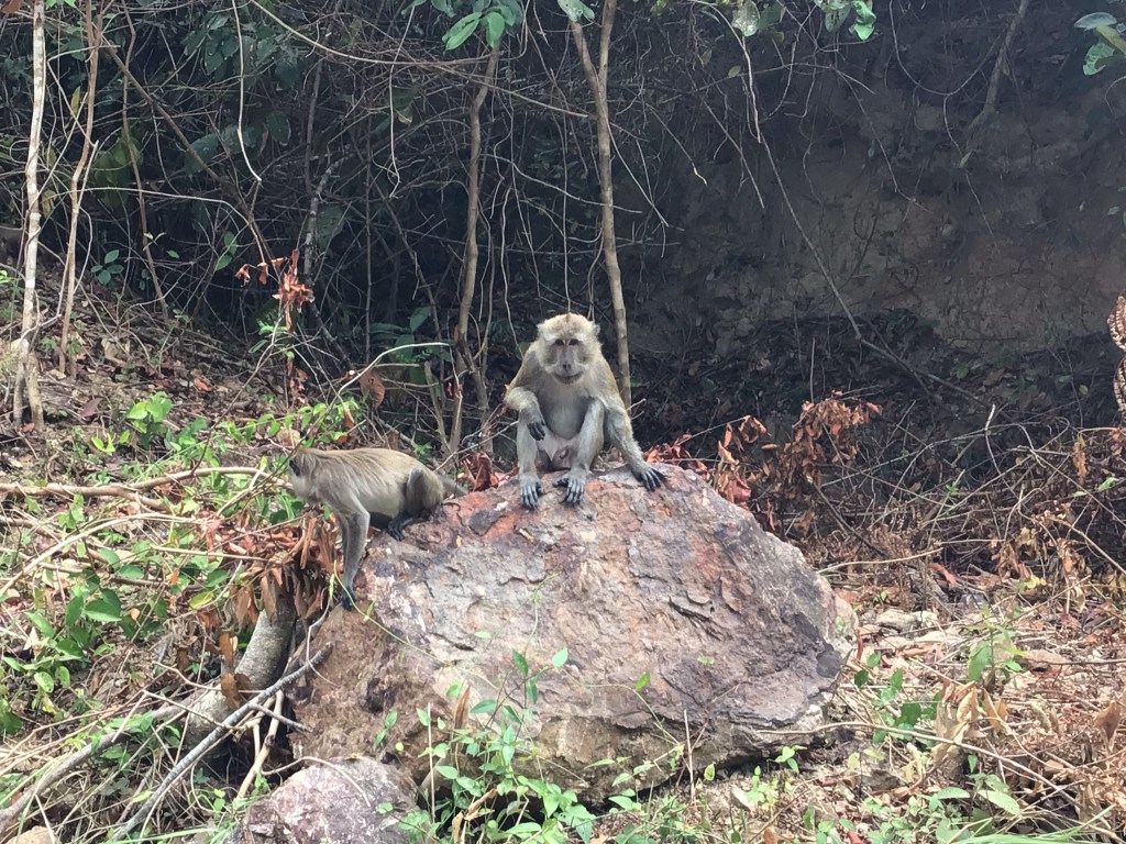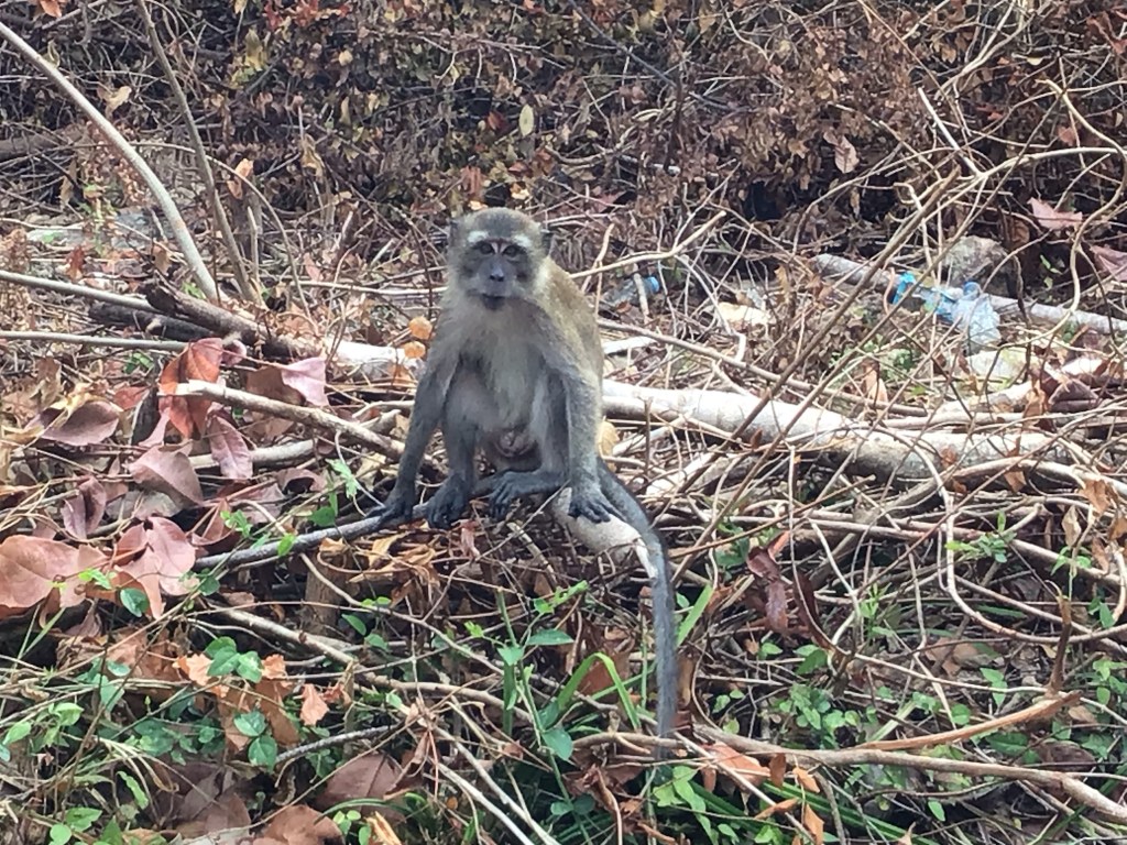 Nous repartons en sens inverse et reprenons les toboggans dans l’autre sens. Arrivé à hauteur de Klong Jark Beach, nous nous arrêtons dans une gargote pour y déjeuner une nouvelle fois de très bons plats thaïs. Puis, nous partons siester sur cette plage. Ensuite ce sera un long plouf dans la mer. De retour à notre serviette, nous entamons la conversation avec un jeune couple de retraités franco-québécois, Joanne la québécoise et Martial le poitevin. Et oui, le monde est petit. Nous passons un long et bon moment à échanger sur nos parcours respectifs. Mais il nous faut retrouver notre home-sweet-home réservé sur Agoda. Au retour, je croise à nouveau des singes « apprivoisés » en attente de leurs détritus.