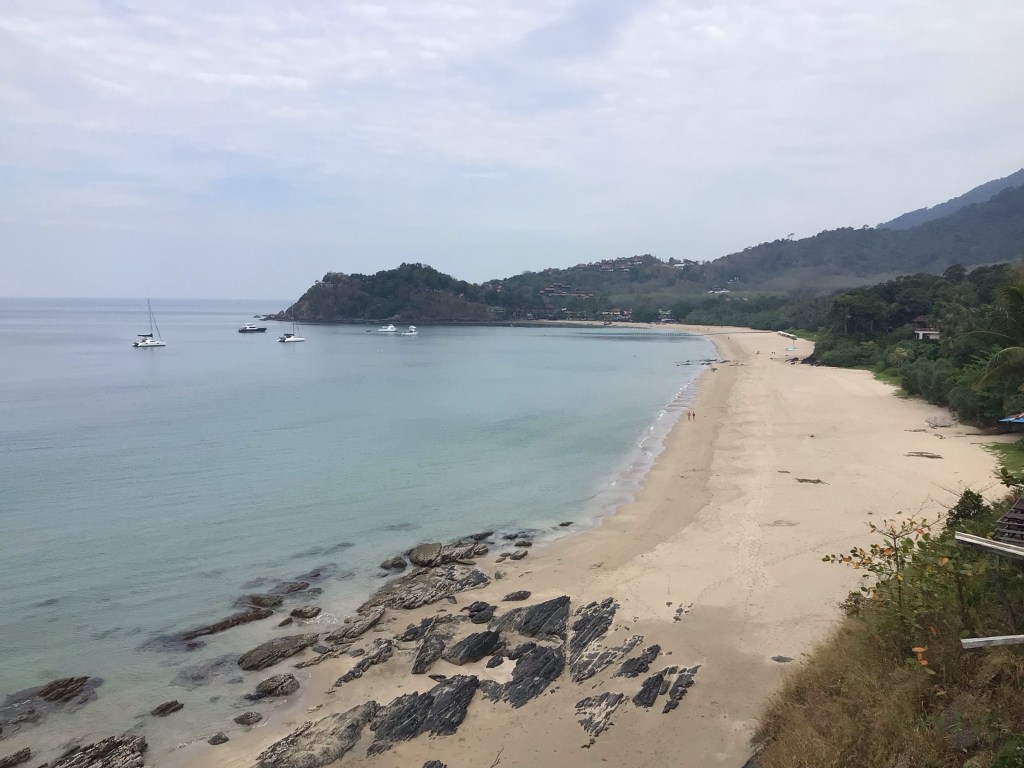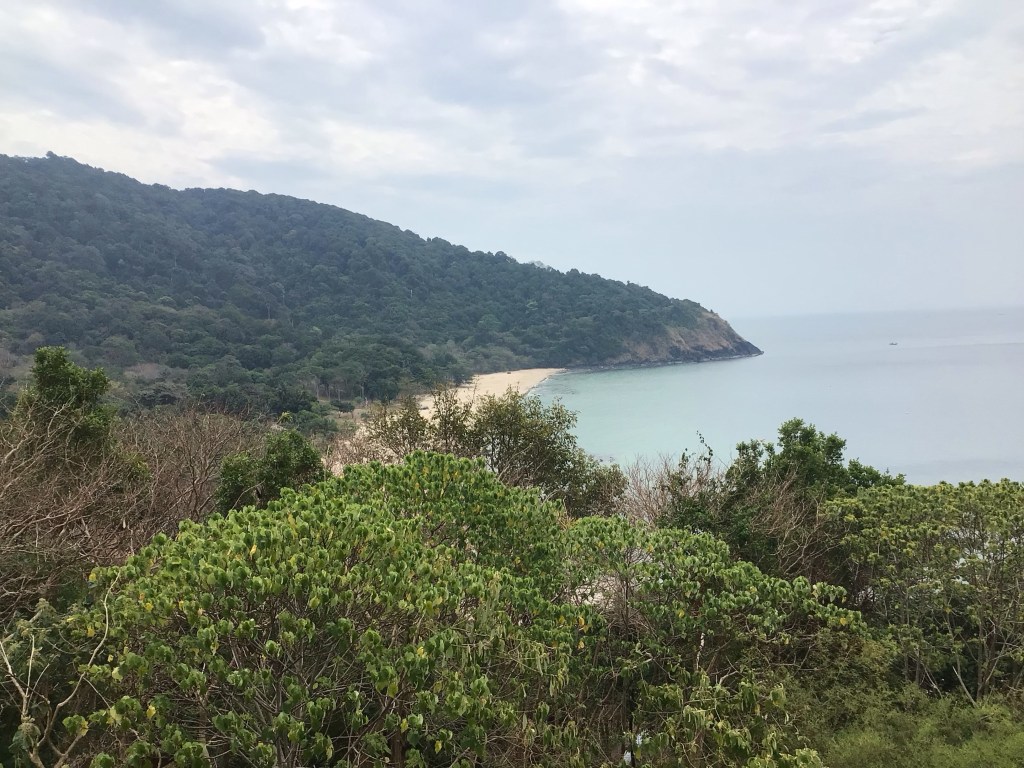 Après cette nouvelle grimpette, nous faisons un arrêt au stand ravito dans un superbe café-restaurant qui surplombe la crique de Bamboo Beach. Je me prends un café glacé légèrement sucré. L’addition n’est, elle, pas sucrée mais salée. 100THB au lieu de 20 à 30 habituels. Il faut que le cadre est superbe. Le paysage devient de plus en plus sauvage.