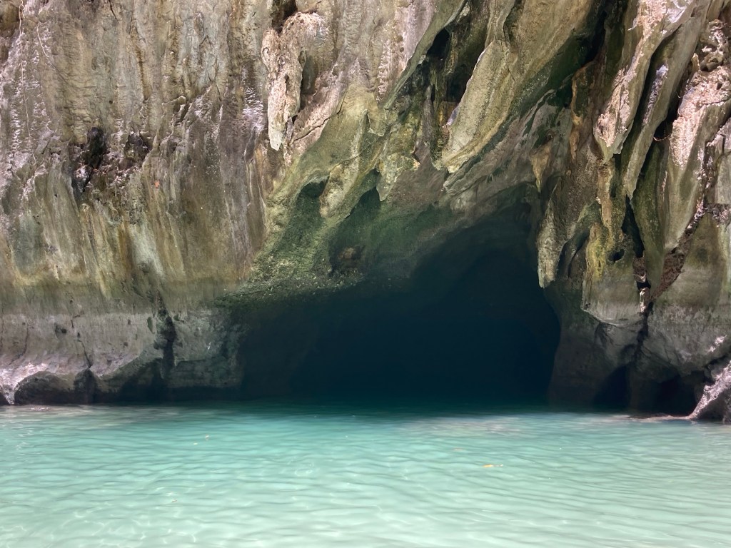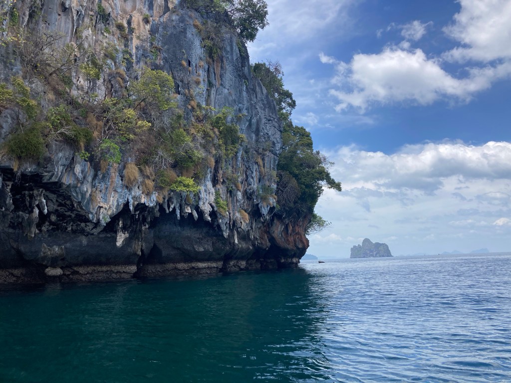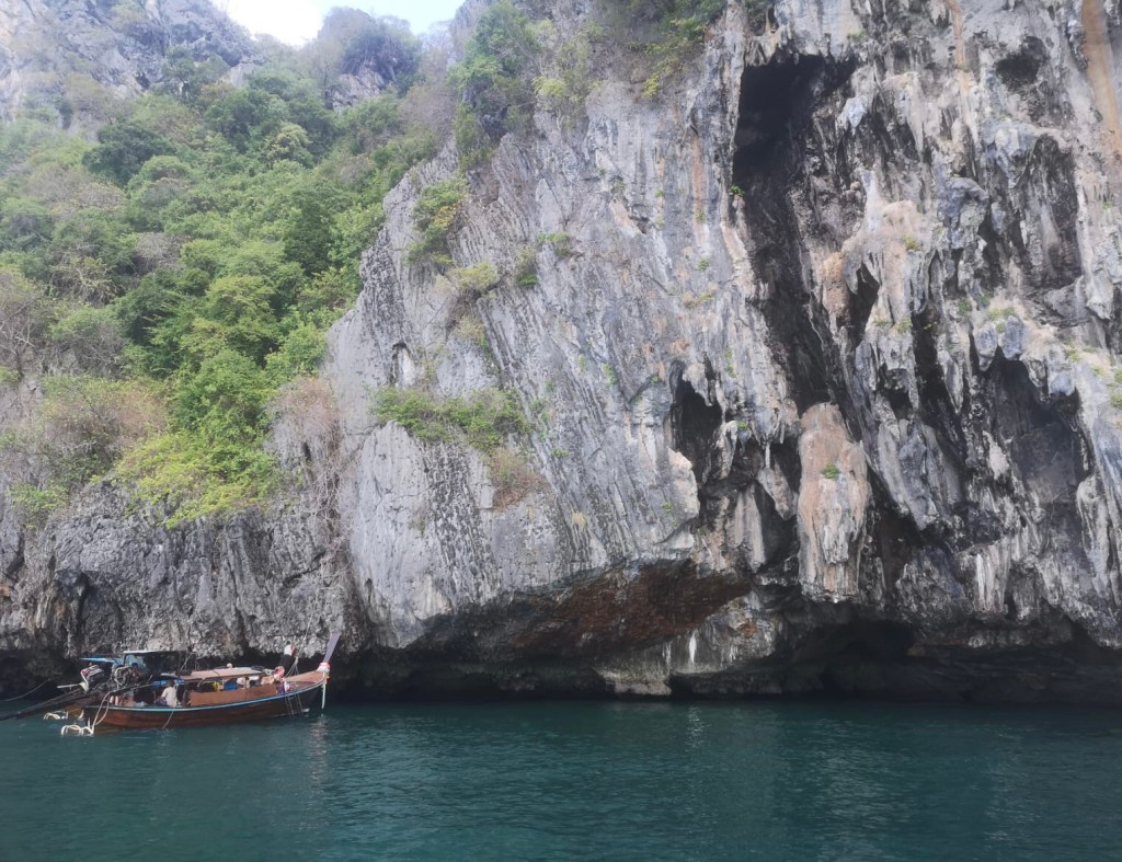 Je longe la paroi rocheuse. Sous l’eau, de nombreuses espèces de poissons et de coraux se laissent admirer. Ensuite, nous reprenons la mer et nous dirigeons vers l’île de Koh Mook et sa fameuse grotte couleur émeraude (Emerald Cave).