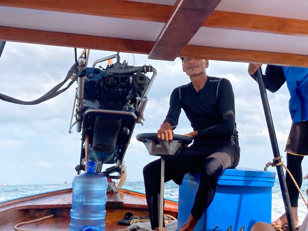 Il nous faut hélas repartir. Nous remontons à bord de notre Long Tai pour un retour pour le moins mouvementé. Le vent a forci. Les vagues se sont levées. Cette fois-ci, c’est à bâbord qu’on chante les plus forts. On se prend les embruns pendant 1h20 sans débander. A l’arrivée, nos affaires de rechange sont trempées. Heureusement, notre Johny Halliday thaï nous attend avec son fiston. Retour à notre case pour une bonne douche et un bon rinçage.