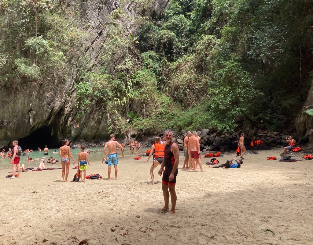 Mais, comme souvent dans ces endroits paradisiaques et touristiques, nous ne sommes hélas pas seuls au monde. Nico a compté environ 150 touristes (5 bateaux de 30) sur chaque spot. Donc voici l’envers du décor. Et on voit clairement que je tire légèrement la tronche. Sur la droite, notre jeune guide en bleu qui se met à plat ventre pour obtenir un meilleur pourboire et, accessoirement, immortaliser une famille suédoise.