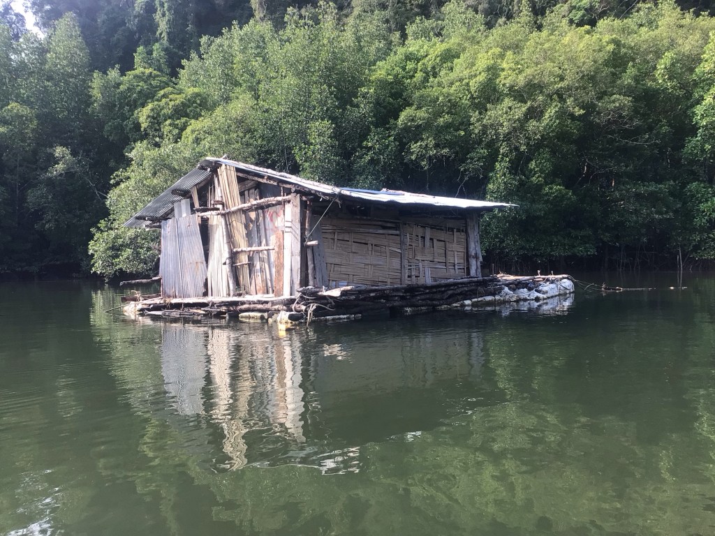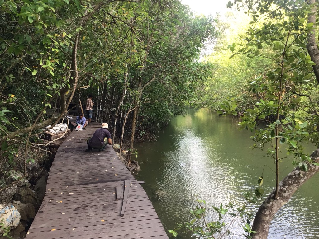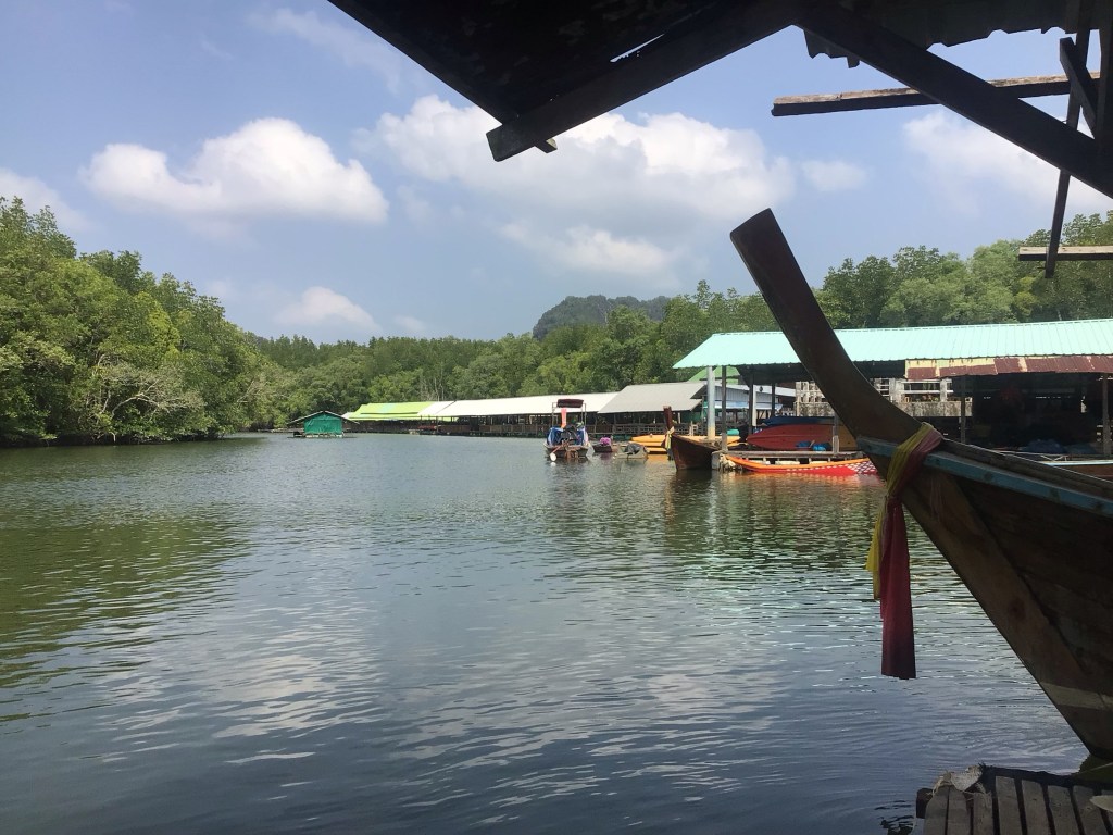 Nous en revenons à la location. Il me dit qu’il est obligatoire de louer un canoë pour s’y rendre. Puis il m’informe des tarifs. Une location coûte 600THB les 3 heures auquel il faut ajouter 300THB pour les gardes du parc national. Si je prends un guide c’est 800. Cela me paraît excessif. Sa femme me dit alors que si je prends un long rail, je peux éviter les gardes et c’est 800THB. Vu qu’il n’y a personne, je négocie à 300THB sans guide pour 1h30. J’enfile mon gilet de sauvetage. Je récupère un sac imperméable, une pagaie et mon canoë. Je quitte le port.