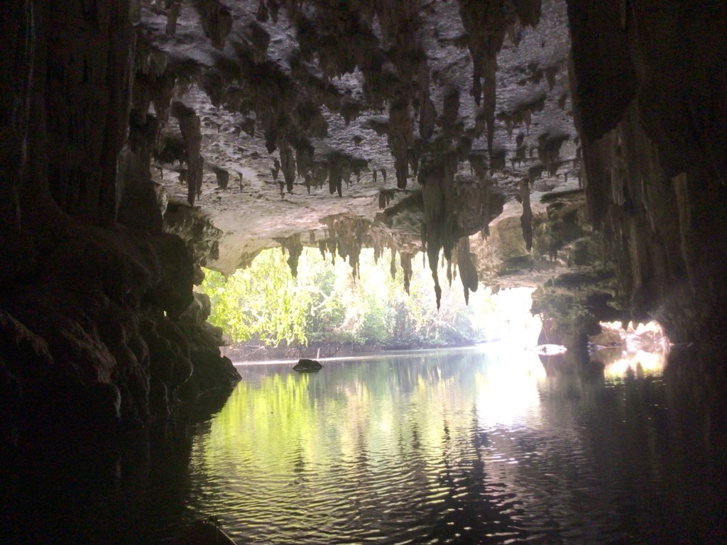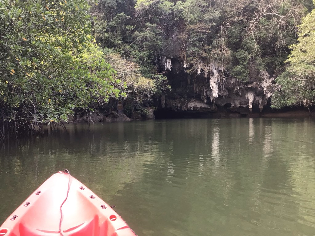 La sortie à l’air libre est également splendide avec ces parois de calcaire, cette forêt vierge et ce bras de mer en contrebas.