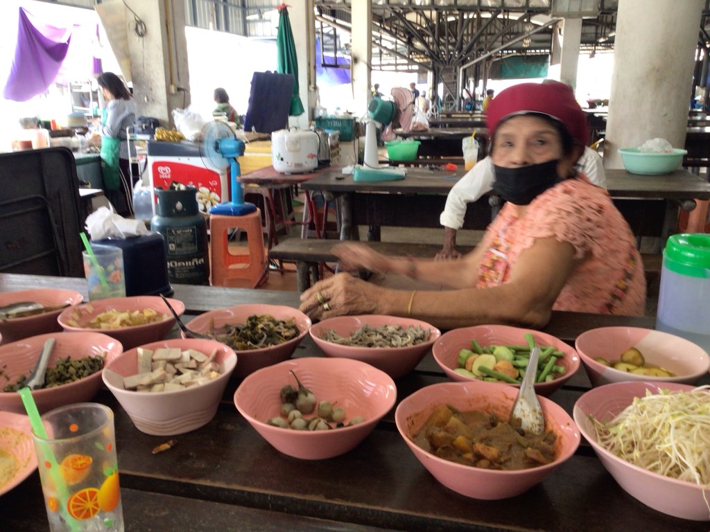 Vers midi, après n’avoir roulé qu’une petite trentaine de kms, j’arrive à Thap Put à l’intersection de plusieurs axes routiers dont la fameuse route principale n°4. Je m’arrête au marché de la ville. Quelques stands proposent leur plat. Cette vieille femme m’interpelle et me propose de m’asseoir avec un autre couple. J’exécute. Elle me sert un plat de mee (nouilles) avec des légumes cuits. Après, j’accomode à mes envies avec tous les autres légumes crus, marinés, vinaigrés, … contenus dans les coupelles.