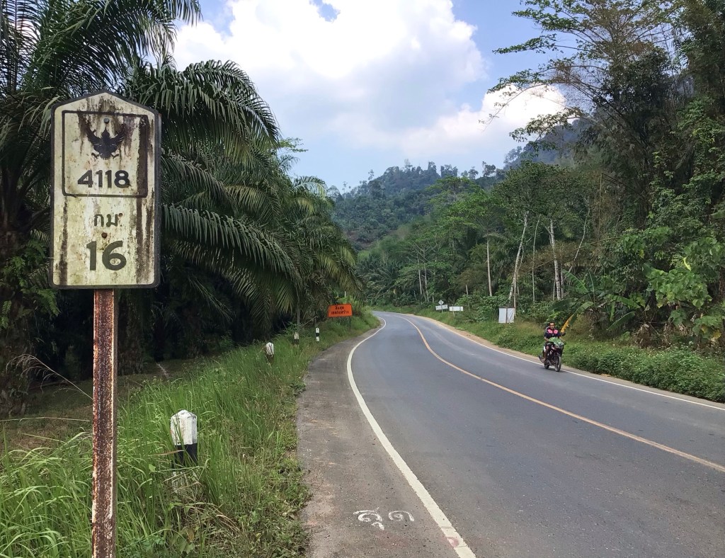 En parlant de temple, je m’arrête dans l’un d’eux pour y faire ma sieste quotidienne. Je dois reprendre des forces avant de parcourir la petite cinquantaine de kms qui m’emmène à Phanom. En effet, il n’y aucune ville, donc aucun hébergement, entre ces 2 villes. Cette route s’avère très agréable. Elle est peu empruntée (un autre axe parallèle se trouve dans une autre vallée). Elle tournicote, monte, descend à travers des forêts primaires, d’hévéa ou de palmiers.