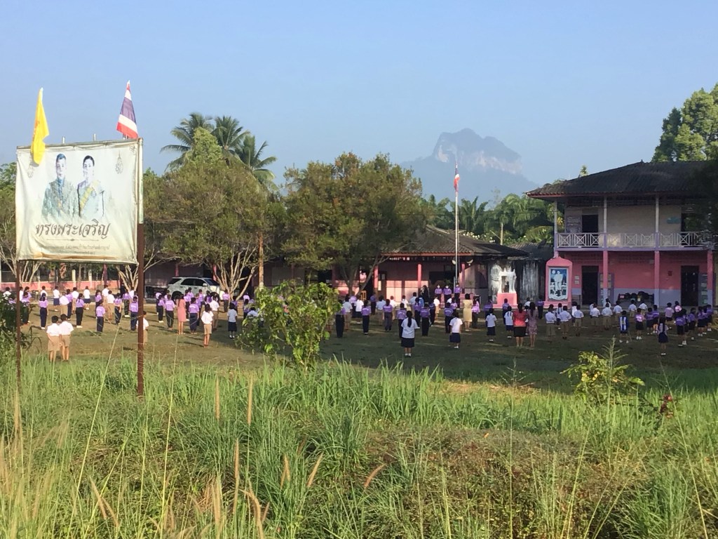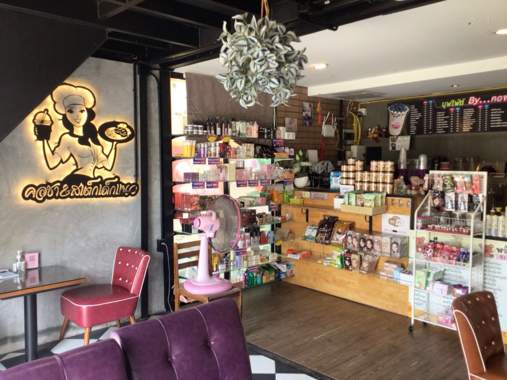 Peu après, j’arrive dans la ville de Khiri Rat Nikhom (j’adore !). Je m’arrête pour ma pause syndicale. Je profite de cette halte et de la wi-fi pour mettre à jour et publier mon dernier article dans ce décor rose bonbon.