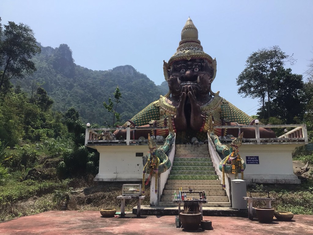 À la sortie de la ville, je tombe sur cet étrange personnage implorant je ne sais quel dieu. Il est situé le long de la route 2020 longeant la rivière. Un peu plus loin, je passe devant le temple de Wat Sathit Khirirom perché sur un promontoire dominant la vallée. Ce sera la seule fois de la journée où je passerai la petite plaque.