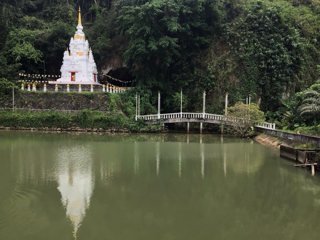 Vers 12h30, je m’arrête dans la seule gargote que j’espère depuis un bon moment. Ce midi, ce sera du riz avec du poisson. Pas le choix. Avant de reprendre la route, la patronne m’offre le café. C’est la journée free coffee ! Puis je repars pour quelques minutes seulement avant de m’arrêter dans le temple de Wat Tham Singkhon pour y faire la sieste.