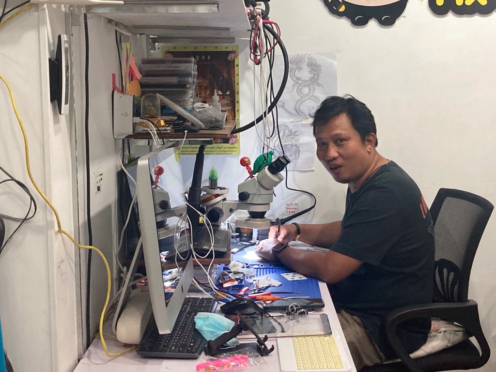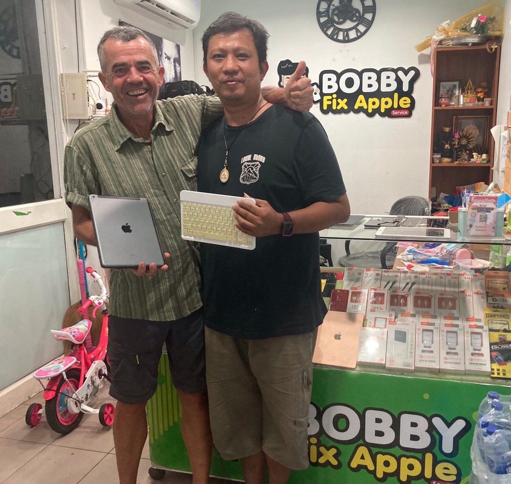 Il rencontre un léger problème. Ce n’est pas la connectique qui est flinguée mais le clavier externe. Toutes les pièces sont étalées sur son établis. Rien n’est remonté. Je suis mal. Il m’informe également que la dernière réparation a été mal réalisée … ce qui explique mes problèmes tactiles. Pour celles et ceux qui me suivent depuis un moment, peut-être vous rappelez vous de mon angoisse avant de partir sur mon trip 2022 Venise-Istanbul. Je n’avais récupéré mon iPad qu’un ou deux jours avant mon départ après avoir mis une sacré pression au patron du magasin de St-Georges à Toulouse. Le boulot a bien été salopé. Je lui propose de tout remonter quand même avec la nouvelle coque noir et le nouveau verre tactile. Et tout cela via traducteur évidemment … Je reste dans le magasin et le laisse bosser. A 20h30, tout est remonté et tout fonctionne à nouveau nickel. Il m’offre même un clavier Bluetooth Qwerty et Thaï ! Le tout pour 75€, la MO n’est vraiment pas chère ici. Avant de quitter la petite famille, sa femme nous prend en photo.