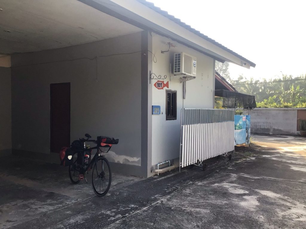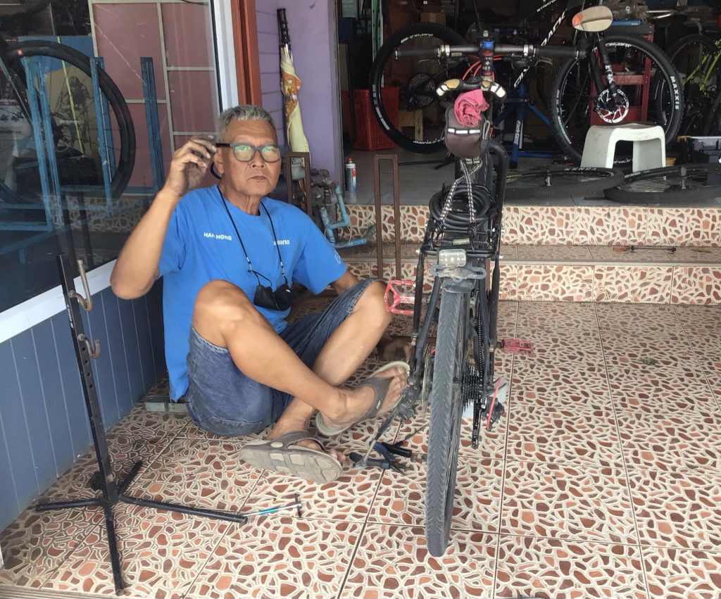 La facture, rédigée sur une feuille de papier par sa femme, s’élève à 1.660 THB (45$). Après une heure de boulot et avec des pièces Shimano, ce n’est vraiment pas cher payé. Peut-être m’a-t-il fait un prix de confrère après que je lui ai montré quelques photos de mes vélos réparés. Je le remercie infiniment.