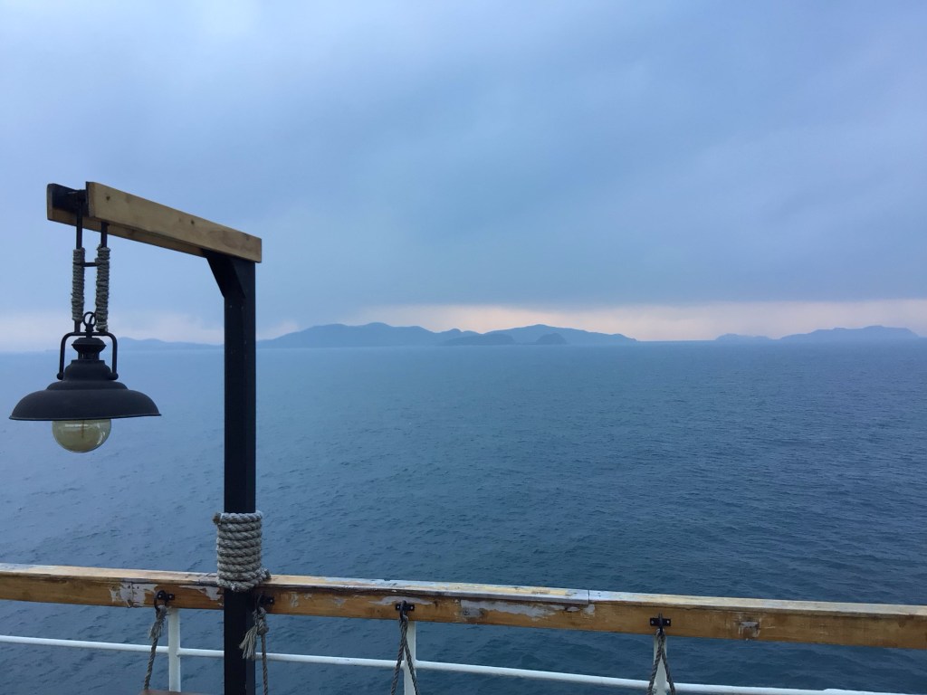 Vers 6h30, je suis déjà réveillé. Ma nuit a été quelque peu hachée, et gâchée, par les vibrations des puissants moteurs de ce ferry. Je m’extirpe de mon caisson pour aller me doucher. Puis je sors sur le ponton. Le jour se lève alors que nous approchons de la côte. Les lumières de la fête sont éteintes. Le ciel est blafard en ce lundi matin. Un peu comme moi d’ailleurs.