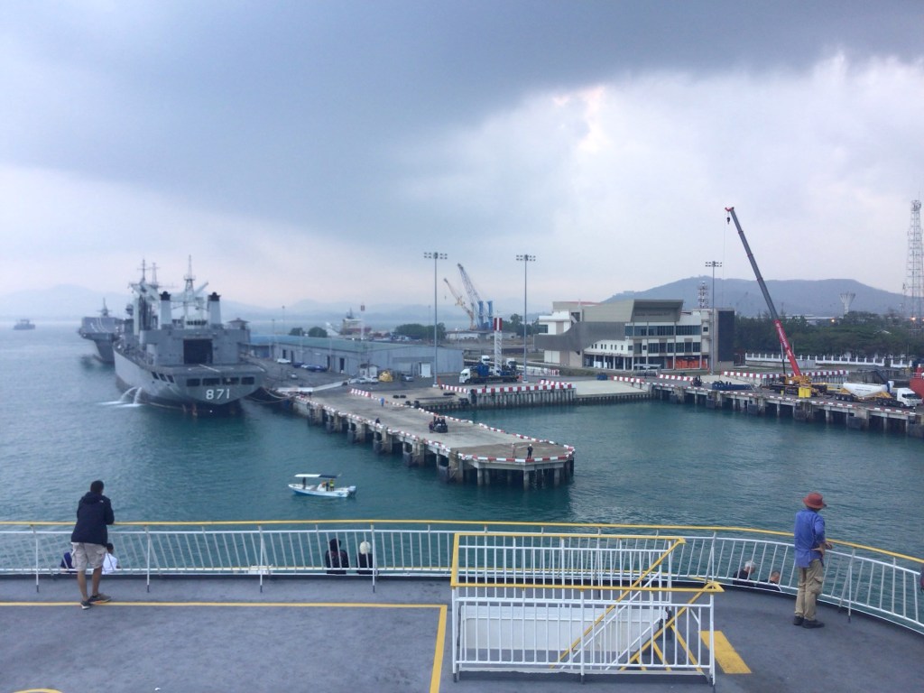 Je retrouve Richard (dont le nom de famille LAUZON sonne bien français) pour boire un café noir sans sucre et sans lait merci. Le ferry entre dans la rade de Sattahip. Nous sommes surpris d’y voir des navires militaires dont un porte-avion. Cette zone est en fait une énorme base militaire. A l’horizon, le temps s’annonce orageux. Première mauvaise surprise de la journée.
