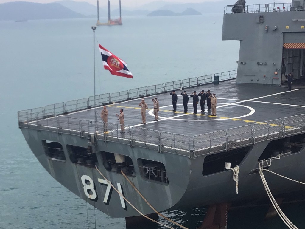 Après bien des manœuvres, aidé en cela par 2 remorqueurs, notre ferry accoste alors que 8 heures sonnent. C’est l’heure du lever de drapeau. Vous remarquerez que l’éléphant est présent au milieu de ce drapeau thaïlandais. C’est probablement l’emblème militaire de ce pays représentant la force.