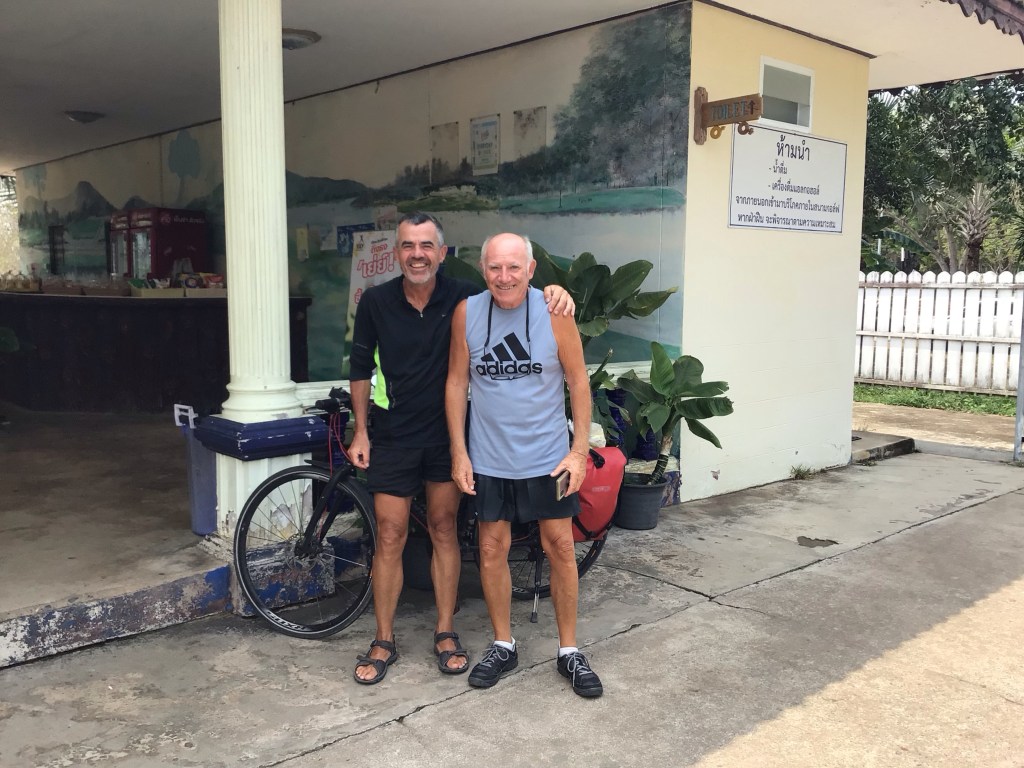Je repère la gare de Ban Phlu Ta Luang à proximité. Je m’y rends. Puis j’appelle mon oncle Dédé pour lui indiquer ce changement de programme alors que nous avions rendez-vous à 10h. Il se trouve en taxi du côté du golf situé juste derrière le massif et le grand lac à 4kms de la gare. Mais son chauffeur, ne parlant que thaï, ne comprend pas les explications de Dédé (ou ne trouve pas sur son GPS) pour qu’il aille à cette gare. Cinquième mauvaise surprise. Je lui dis de rester sur place et je le rejoins à vélo. Il et 10h30 quand on se retrouve enfin. Avant d’oublier, il me donne la carte de Malaisie et les patins de frein expédiés par Gisèle, la maman de Nico. Je ne sais pas si j’aurais l’occasion de les lui donner en Asie. Pour le moment, nous allons reprendre des chemins séparés.