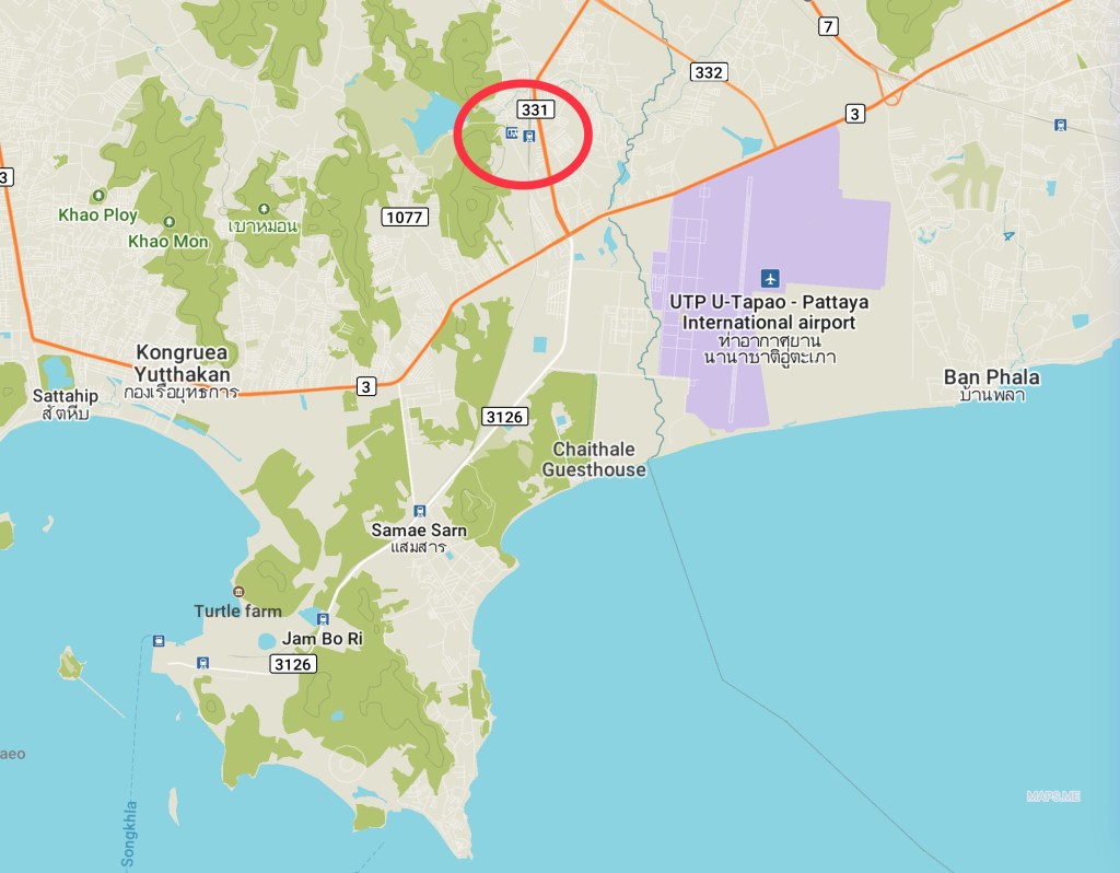 Mais le temps passe vite en si bonne compagnie. Vers 15h00, mon oncle appelle un taxi pour le ramener dans ses pénates de Casa Espana. De mon côté, je réserve un hôtel de l’autre côté de l’aéroport de U-Tapao Pattaya … situé à Sattahip ! Avant de quitter ce beau golf, je ne peux résister à la tentation de photographier cette golfette avec son chauffeur-caddy rose et son élève. Je n’aurais pas vu un seul golfeur marcher depuis notre arrivée …