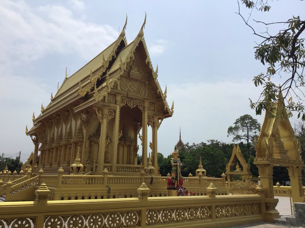 Alors que je sors de cette grande ville de Rayong en contournant un nème complexe industriel, je traverse ce temple pour rejoindre une petite route secondaire. Il s’agit du charmant temple doré de Wat Pluak Ket.