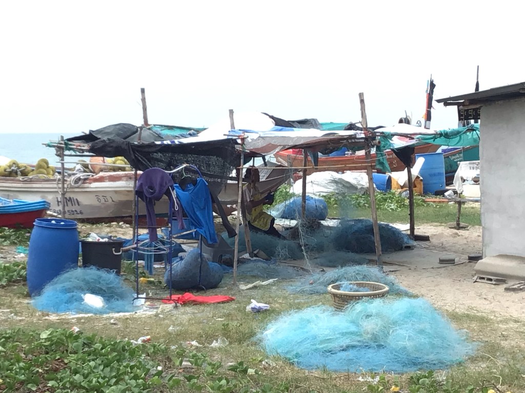 Dans ce coin, aucune structure touristique ne s’est implantée. De ce fait, des villages de pêcheurs sont encore présents. La pauvreté ressurgit. Ici, c’est une femme de marin-pêcheur qui est occupée à ramender sous un abri de fortune.