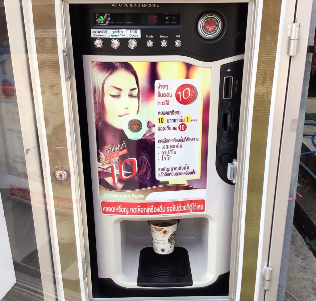J’arrive ensuite dans le pittoresque village de Bang Phe où, à son entrée, un panneau indique les 100 ans d’existence du marché local et de sa grande rue commerçante. Quant à moi, je retombe sur une machine à café, thé ou cacao. La précédente était en panne. Celle-ci fonctionne. Avec une pièce de 10THB (0,25€), je me bois un café sucré au lait. Pas le choix.