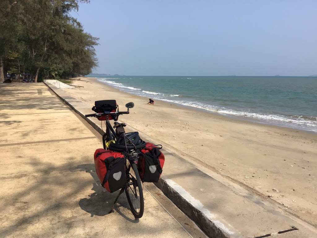 La plage sur cette baie est magnifique. De ce fait, quelques resorts ont été construits. Mais cela reste raisonnable. D’ailleurs, mon futur hébergeur me confirmera que, dans cette baie, il y a surtout du tourisme local. Plus loin, ce sont surtout des scandinaves qui font marcher le business. Je poursuis ma descente du Golfe de Thaïlande. La chaleur est toujours aussi prégnante. L’heure avance. Les side-cars de plage ne vont pas tarder à plier bagage.