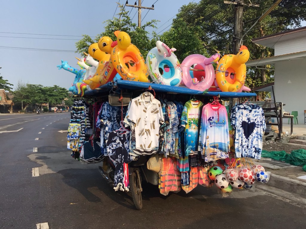 Je sors du village par un cheminement piéton qui longe la mer. Depuis un moment, je circule sur la droite de la route pour profiter de l’ombrage des arbres et de la vue sur mer. Sinon, si je respecte le code thaïlandais, je devrais circuler à gauche en plein cagnard et sans trop voir la mer. Bien évidemment, je le fais vu que la circulation n’est pas très dense. D’ailleurs, cela arrive souvent de croiser des scooters ou des side-cars ambulants à contre-sens.