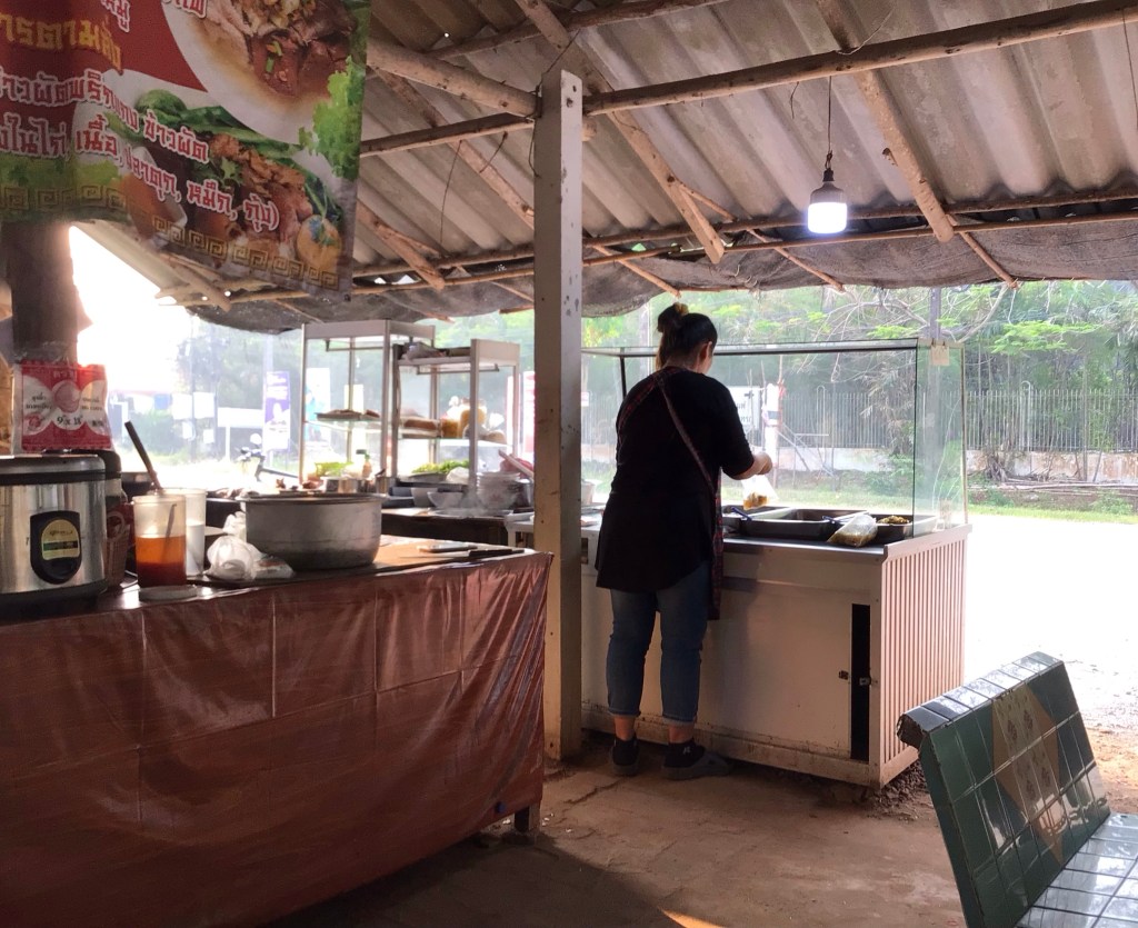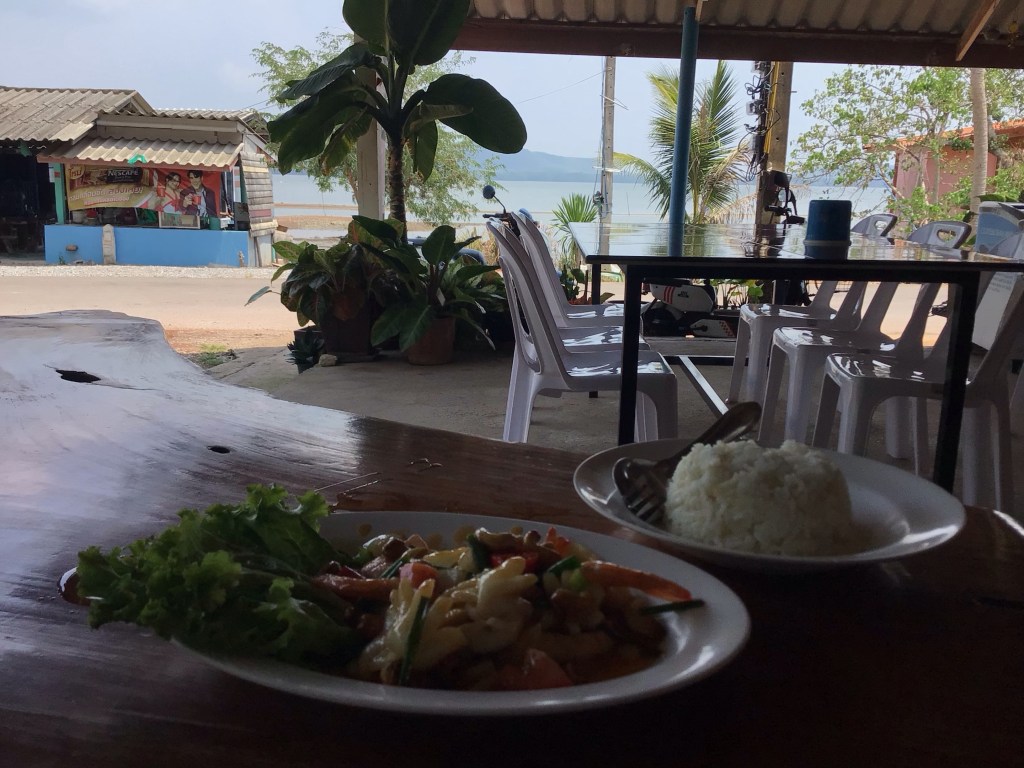 Je retrouve le front de mer et la baie de Laem Maephim. Et également une gargote où je m’arrête déjeuner. Il n’y a pas encore foule. Quelques scooters s’arrêtent récupérer une poche alors que la cuisinière s’active au fourneau.