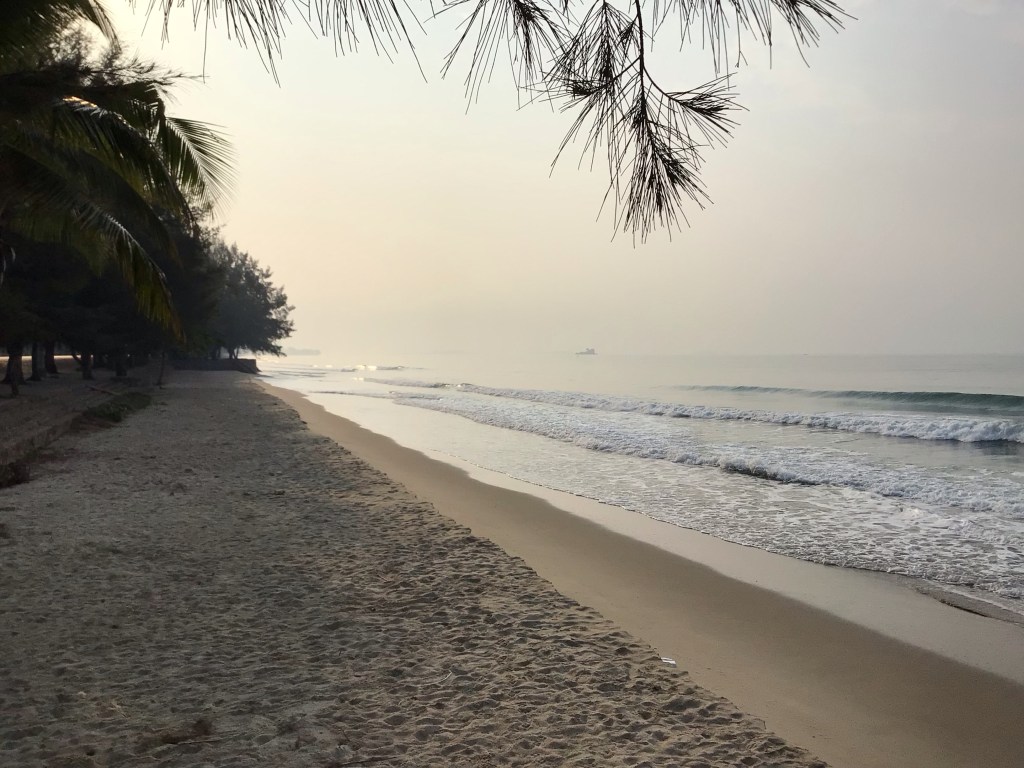 Peu avant 8h00, je me pose à Mae Pim Beach. Je salue quelques joggeurs et marcheurs qui profitent de la douceur matinale et de cette belle lumière.