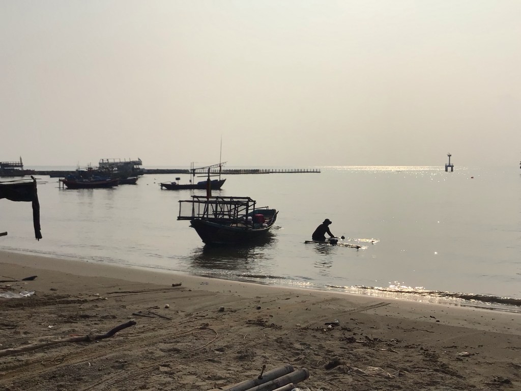 Après avoir franchi la pointe de Laem Maephim, le décor change. Finies les belles baies aux plages de sable fin. La côte devient inhospitalière. Je m’arrête une dernière fois en bordure de mer. Un pêcheur vient de rentrer au port et remonte son bateau à quai.