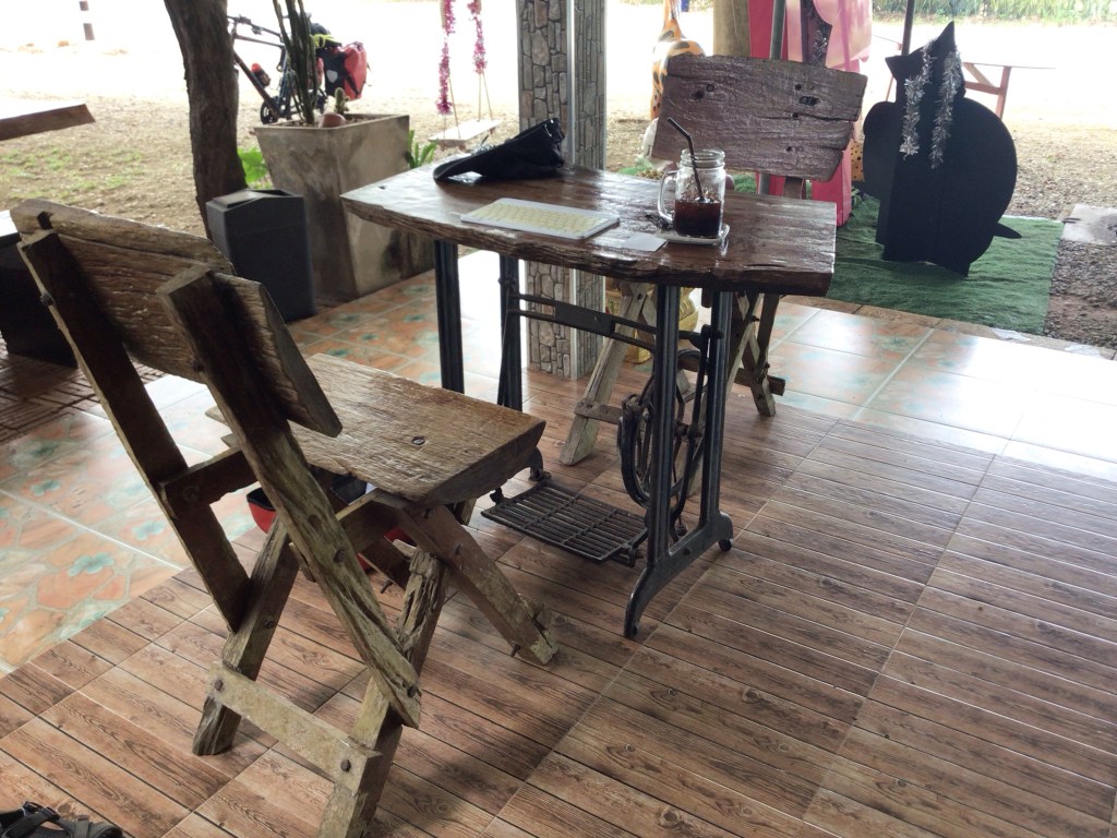 Je poursuis ma route plein est avant de remonter vers la ville de Chanthaburi. Je retombe sur la route dénommée Scenic Road déjà longuement empruntée lors de notre descente de la Thaïlande. En milieu de matinée, je m’arrête pour ma pause café glacé. Je le déguste sur une table confectionnée à partir d’une ancienne machine à coudre. Cela me rappelle évidemment la Singer de ma grand-mère maternelle. D’ailleurs, on en parlait avant-hier avec Dédé (de ma grand-mère pas de la Singer). Elle était le calme et la douceur incarnés par rapport à mon grand-père si tempétueux. Je les adorais tous les deux. J’ai passé tellement de bons moments en leur compagnie.