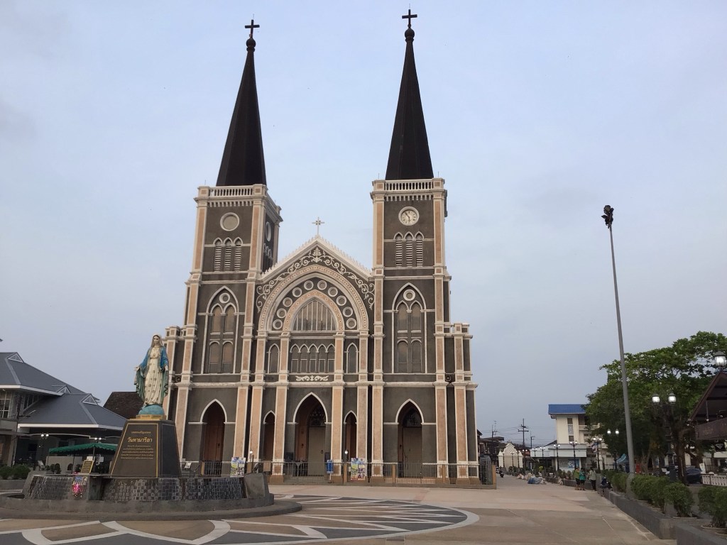 Il ne me reste plus qu’à parcourir la dernière ligne droite avant d’entrer dans Chanthaburi (ville de la lune). Alors que j’attendais mes photos, j’en avais profité pour réserver un lit dans une auberge de jeunesse. Comme cela, je n’ai pas à tournicoter en ville. Je me rends direct à cette auberge que je trouve très facilement. Par contre, en entrant à l’intérieur, l’odeur forte et acide de chats me prend à la gorge. Ce n’est pas une auberge de jeunesse mais de chanesse ! J’en dénombre 6 plus 2 chiens riquiqui. Heureusement, mon dortoir du 4è leur est interdit. Après ma douche, je pars à pied découvrir cette ville très peu prisée par les touristes.