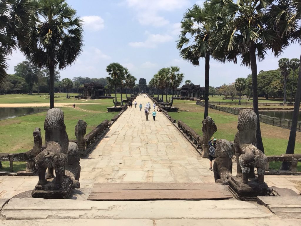 Je les remercie en leur souhaitant tout le bonheur du monde ainsi qu’à Jean-François, un de mes anciens boss, et sa charmante épouse dont je viens d’apprendre par FB le mariage. Puis je reviens vers le temple d’Angkor Wat. Après avoir traversé les douves sur un pont flottant, je franchis la traditionnelle sculpturale porte.