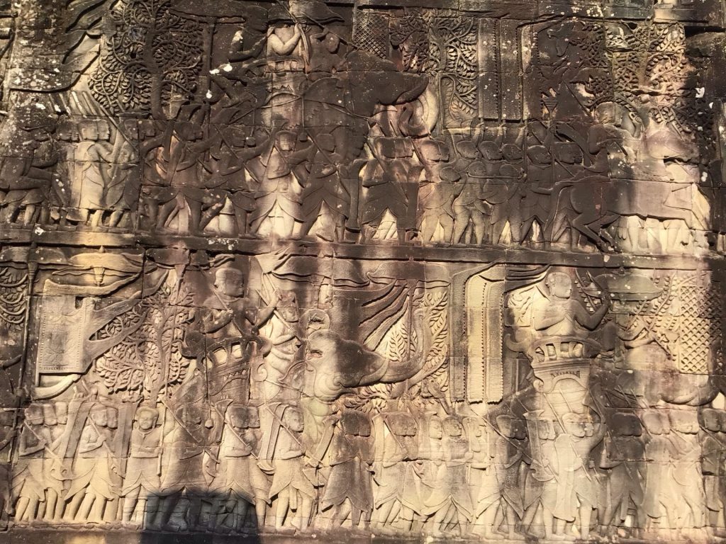 Avant d’accéder au temple principal de Prasat Bayon (point 4), j’admire la fresque qui court tout le long d’une partie du temple. Elle représente la Marche de l’armée Khmer.