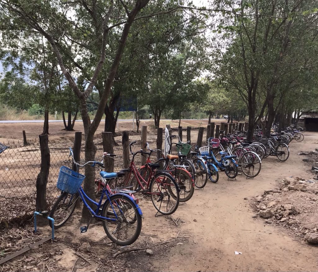 Cette petite montagne qui culmine à 500m d’altitude est en fait le Phnom Tbeng National Heritage. Il est possible d’y randonner et de faire de l’éco tourisme. Pour aujourd’hui, j’ai mon compte. Je reste sur ma route vallonnée. Peu avant midi, je m’arrête dans la bourgade de Srok Kulaen pour y déjeuner. Après avoir ingurgité un plat avec des abats et des insectes (véridicte) et du riz, je me pose sur une plateforme ombragée pour une sieste bien méritée. Je ne mets par le réveil. C’est une jeune femme, faisant la vaisselle dans une bassine, dans la cabane d’à côté qui me réveille. Il me reste une trentaine de bornes à parcourir. La chaleur est étouffante. Même mon iPhone se met en alerte chaleur. De toute façon, c’est toujours tout droit. A la sortie de cette bourgade, je me pose devant l’école pour prendre en photo le parc à vélos sur la gauche alors que sur la droite se tient le parc à scooters.
