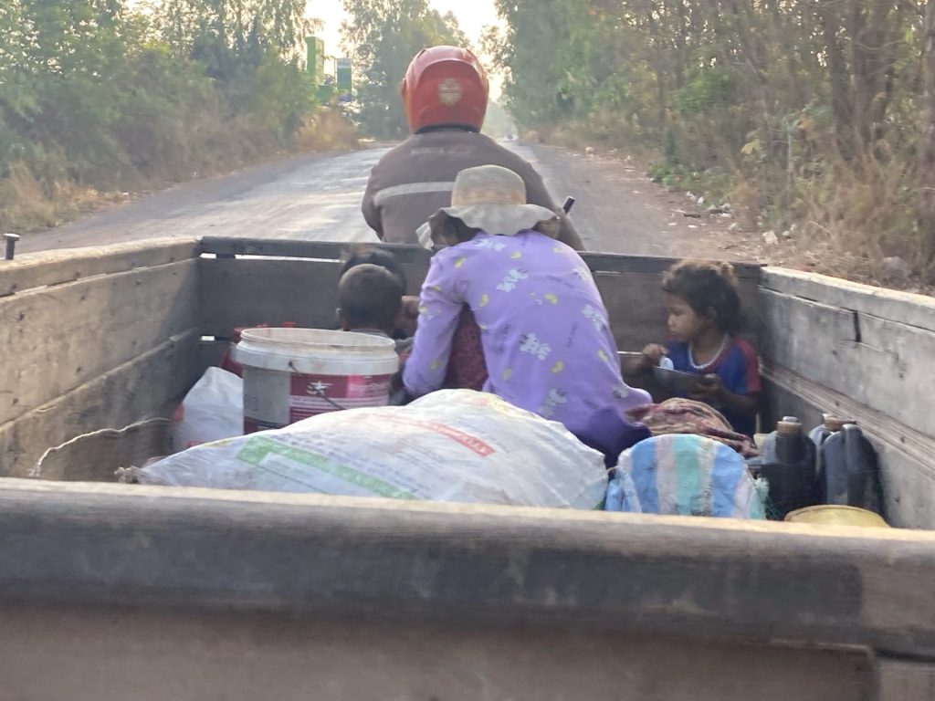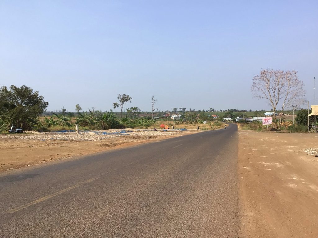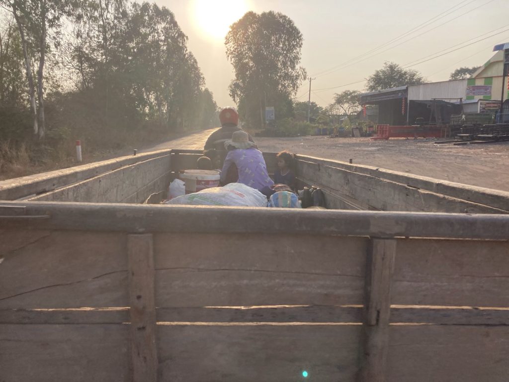 Tout le monde dort encore quand je pars. Tant pis. Je traverse pour la nème et dernière fois la bourgade de Svay Leu bien animée en ce vendredi matinal. Peu après la sortie de la ville, je me fais doubler par un de ces engins agricoles tirant une longue charrette. J’accélère pour revenir dans ses roues, ou du moins dans sa charrette.