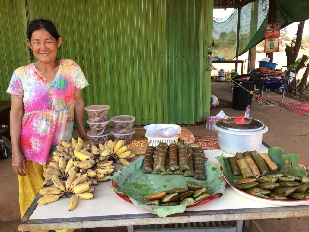 Quelques kilomètres plus loin, j’arrive dans la bourgade de Kuleaen. Je bifurque à gauche pour me diriger vers le temple de Koh Ker. Je vais me renseigner sur le prix du billet qui est de 15€. Cela reste raisonnable. Mais j’hésite à aller visiter ce site composé de nombreux temples. Je n’ai pas envie de rouler tout l’après-midi en pleine chaleur. Si je m’arrête, je vais y passer 2 bonnes heures selon la personne au guichet. Tant pis. Je repars mais pas pour longtemps. En traversant le village, je fais un nouvel arrêt au stand pour déguster ces fameux gâteaux de riz sucrés. J’en achète 2 ainsi qu’un régime de petites bananes. Cela ne me coûte que 0,50€ et me permet de remettre de l’essence dans le moteur. La route est encore longue.