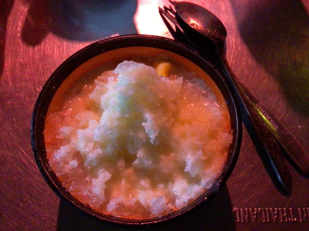 Et, c’est ma foi fort bon ! C’est un mélange de tapioca, d’omelette sucrée, de deux fruits confits, d’un morceau de gélatine et d’un autre ingrédient sucré. Le tout servi dans de la glace pilée et arrosée d’une sauce. Je me régale et en prends un 2eme bol. Après ce festin sucré, je rentre dans ma chambre. Fin de cette nouvelle étape de 100kms. Demain, je continue ma route vers l’est.