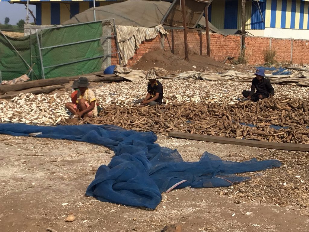 Puis, après quelques kms parcourus à bonne allure et bien à l’abri, ma charrette bifurque à droite. Dommage. J’aurais bien tracé la route comme cela. Celle-ci est moins monotone que prévue. De plus, le profil n’est pas plat. Ce ne sont que longues montées puis longues descentes dans un paysage rural. D’ailleurs, arrivé en haut d’une bosse, je fais une pause pour prendre en photo ces travailleurs laborieux. Ils sont en train de couper du manioc avant de le faire sécher au soleil.