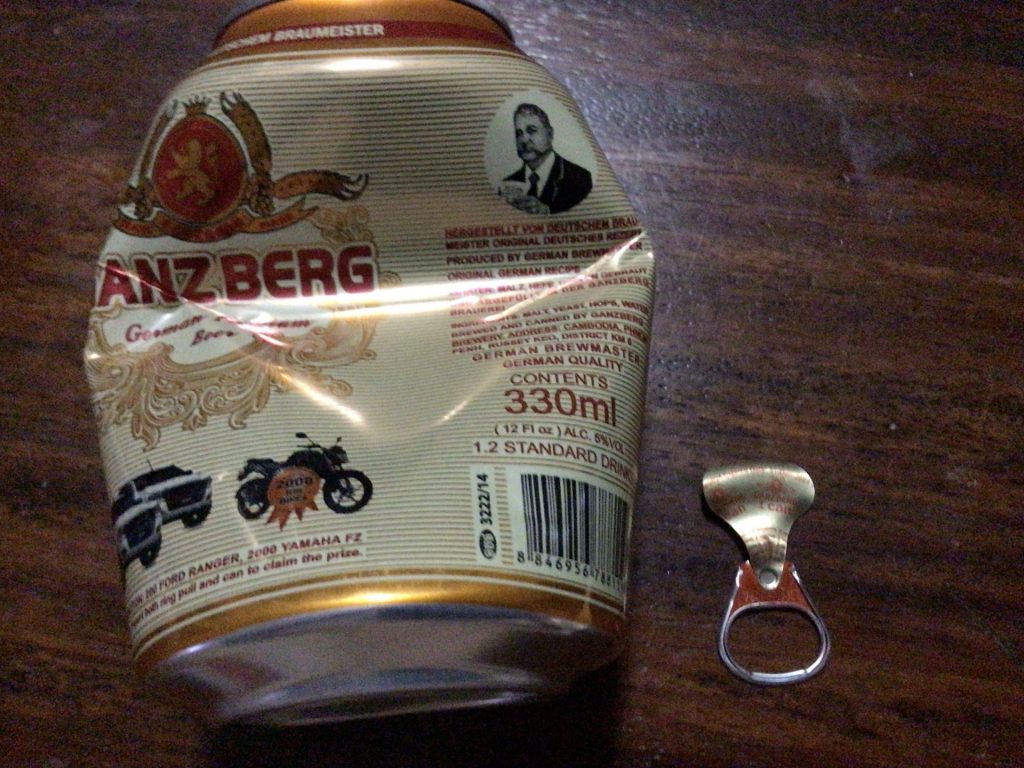 A 15h30, je me rends à la première guesthouse repérée sur ma carte. Je négocie la chambre avec ventilo à 5$; avec clim, c’est deux fois plus cher. Le ventilo me va très bien. Je me fous à loilpé et dirige le ventilo sur moi. Après m’être installé et douché, je vais me chercher un café glacé à un kiosque juste à côté. Pas de café. Tant pis, je prends une Ganzberg bien fraiche. Andy m’informait hier soir que c’était la marque d’un brasseur allemand mais qu’elle était fabriquée au Cambodge. Et, surtout, qu’il fallait surveillé la tirette lorsqu’on l’ouvrait. 200 voitures, 2000 motos … ou une autre bière peuvent être gagnées. Hier soir, malgré notre lourde conso, nous n’avons rien gagné. Là, coup de bol, j’en gagne une autre. Ce sera pour ce soir.