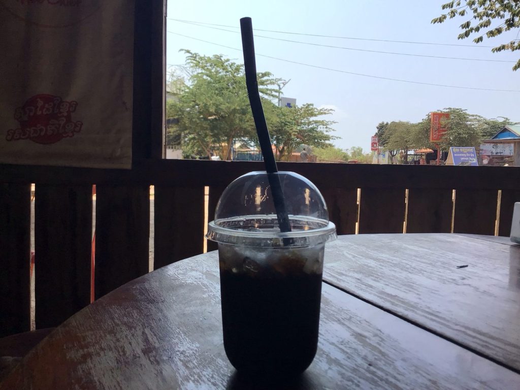 Donc. Imaginez que vous rouliez sous le cagnard depuis bientôt 2 ou 3 plombes. Les longues montées se succèdent. Les cuisses durcissent dans l’effort. Le paysage est d’une sécheresse infinie. L’eau de votre gourdasse est déjà chaude. Le vent chargé de poussière et de chaleur vous assèche la bouche. Le short et le maillot sont déjà ruisselants de sueur. Au loin, un kiosque à café apparaît. C’est enfin l’heure espérée. Il est tenu par une jeune et charmante cambodgienne au sourire Ultra-Brite. Vous passez votre commande en langage petit nègre : a black café with sweet sugar som toï. Rien que de regarder la préparation du café glacé est un plaisir. Elle vous sert votre verre rempli de ce liquide noir et glacé. Vous trempez la paille à l’intérieur. Les glaçons s’entrechoquent. Vous avalez une première gorgée. Ce n’est pas de la bière mais c’est aussi bon. La suavité du café glacé légèrement sucré vous descend dans le gosier. Vous croquez de petits morceaux de glace pilée qui vous rafraîchissent le palais. C’est frais. C’est bon. On se croirait à la montagne.